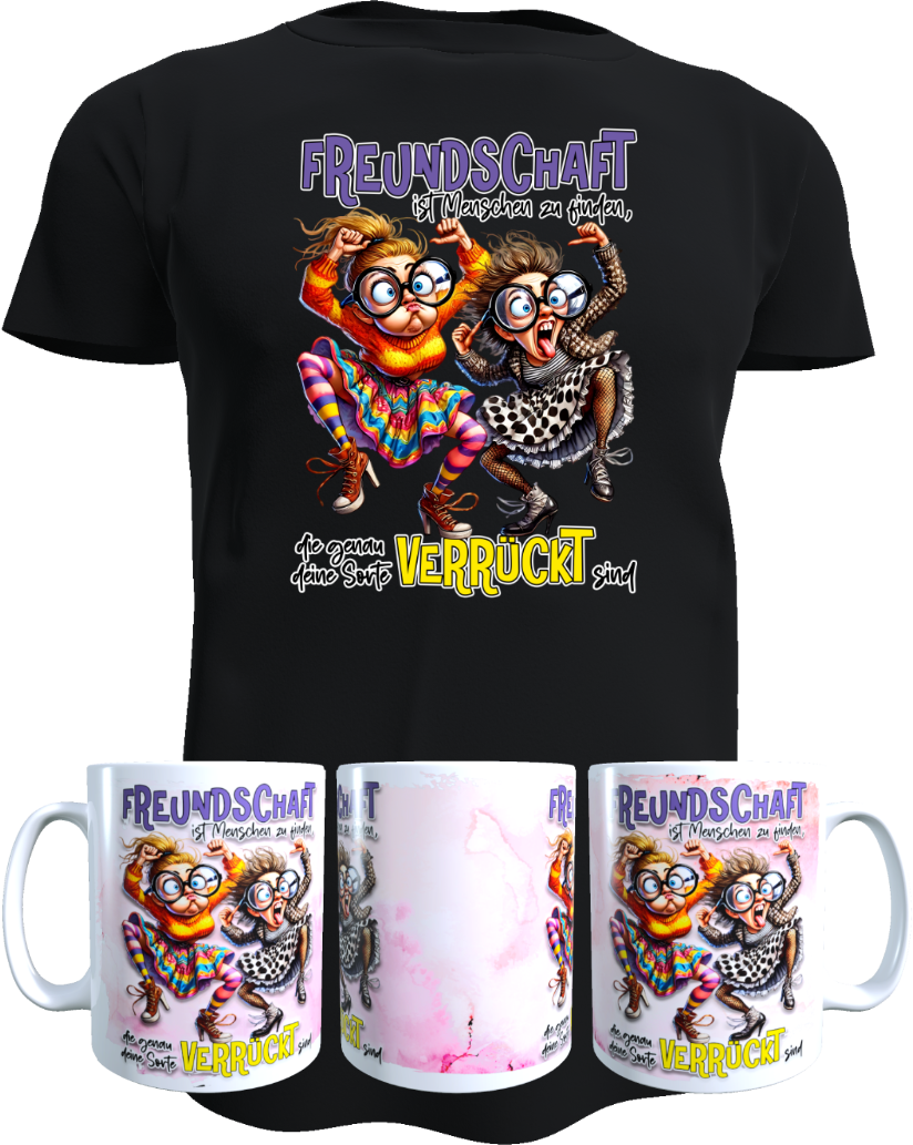 Mit diesem lustigen Freundinnen-Motiv kannst du genau das feiern – ganz egal, ob du dich für ein bequemes Shirt oder eine witzige Tasse entscheidest.
